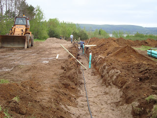 The sewer and water lines are in and, after a bed of sand the power goes in. There will be 5 poles in the park and the rest is underground.